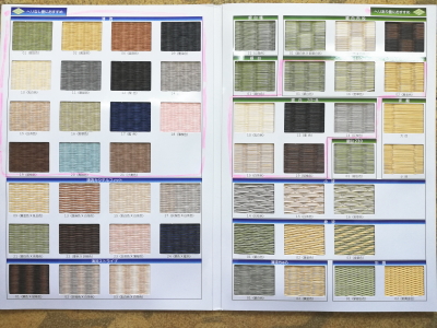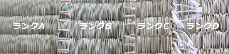 天然イグサは化学床、ワラ床双方とも使用できます。天然イグサは国産から輸入品まで、下の写真のように、いくつかのランクに分かれておりますので、耐久性・ご予算などに応じて、お客さまに選んでいただきます。